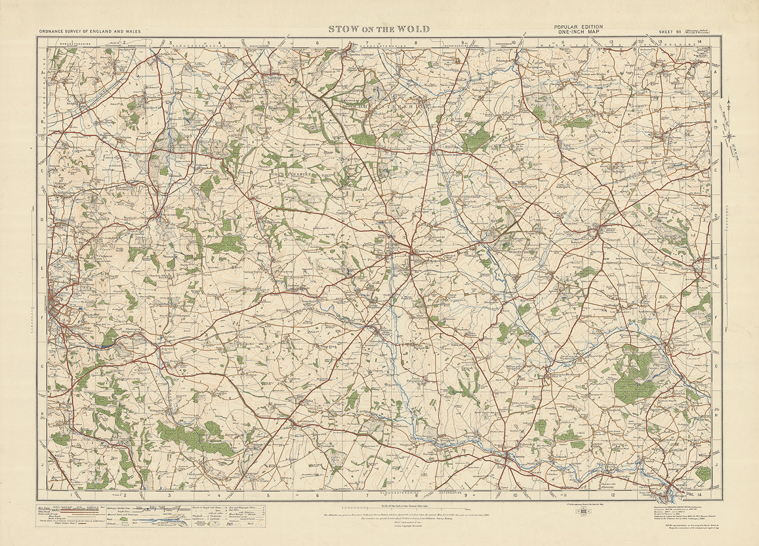 This old Ordnance Survey map, Sheet 93 - Stow on the Wold, is a fascinating piece of cartographic history from the renowned One-inch "Popular" edition of England and Wales, published in 1925. The map showcases the towns, cities, and interesting features of the region, providing a unique glimpse into the past. Stow on the Wold, a historic market town located in the county of Gloucestershire, serves as the focal point of this map, surrounded by other notable settlements such as Moreton-in-Marsh, Chipping Norton, Bourton-on-the-Water, Witney, and the picturesque Cotswolds Area of Outstanding Natural Beauty (AONB).