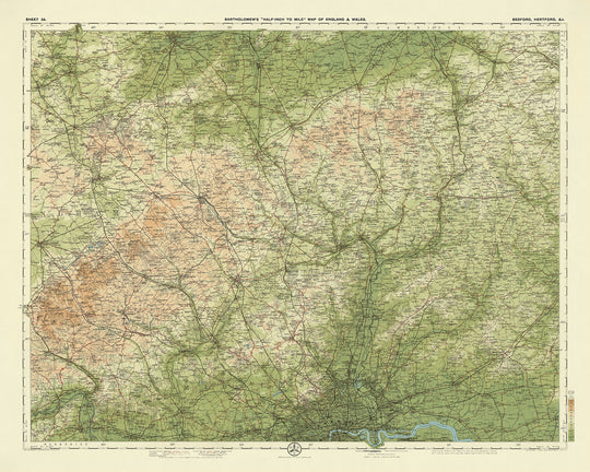 The map's design is a marvel of cartographic innovation, employing a subtle gradation of colour bands to depict landscape relief. This technique, distinctive to Bartholomew's maps, allows for a nuanced understanding of the terrain, highlighting the undulating hills and valleys that characterize the region. The Chiltern Hills, a prominent feature on the map, are rendered with a gentle yet precise touch, inviting the viewer to explore the natural beauty of the area. The careful layering of colours not only enhances the map's visual appeal but also provides a practical guide for navigating the varied landscapes of Bedfordshire and Hertfordshire.