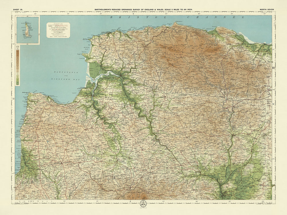 The map's design and style reflect Bartholomew's dedication to creating maps that are both functional and aesthetically pleasing. The use of different layers of color to represent landscape relief was a pioneering technique that set his maps apart. This innovative approach, combined with the detailed depiction of political and physical features, makes Sheet 35 - North Devon a remarkable example of early 20th-century cartography. It is a testament to Bartholomew's skill and vision, offering a fascinating glimpse into the past for modern-day collectors and history enthusiasts.