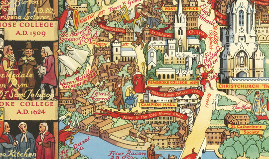 A gorgeous pictorial map of Oxford, focusing on on the centre of town and the university colleges there. The map was originally published in 1948 by Kerry Lee.
