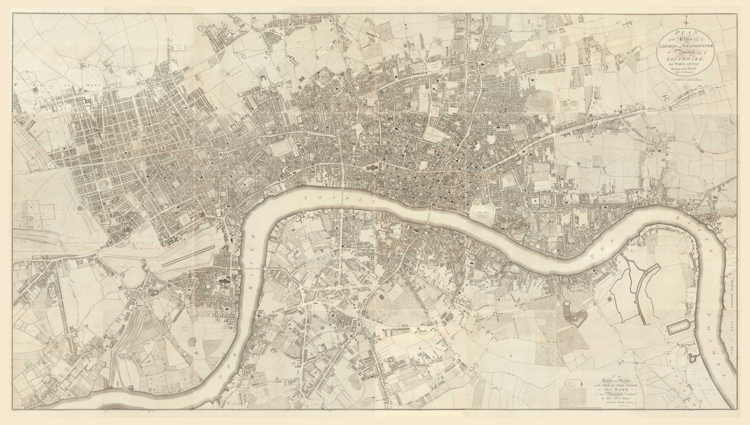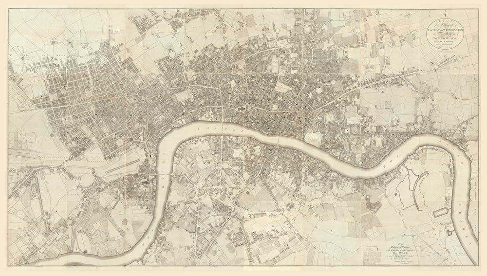 This map is very similar to the John Rocque map of London which was published 50 years prior, but it has a lot more detail. While Rocque mostly sketched in high density areas such as the City of London, Horwood actually mapped every single house.