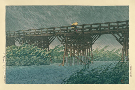 Evening Rain at Imai Bridge by the revered artist Hasui Kawase is a striking exploration of nature's beauty and urban tranquility, captured in a traditional Japanese woodblock print from 1935. Hasui Kawase was a leading figure in the shin-hanga movement, renowned for his exquisite landscapes and mastery of atmospheric effects. "Evening Rain at Imai Bridge" beautifully exemplifies his ability to convey emotion through delicate depictions of seasonal weather and serene locales.