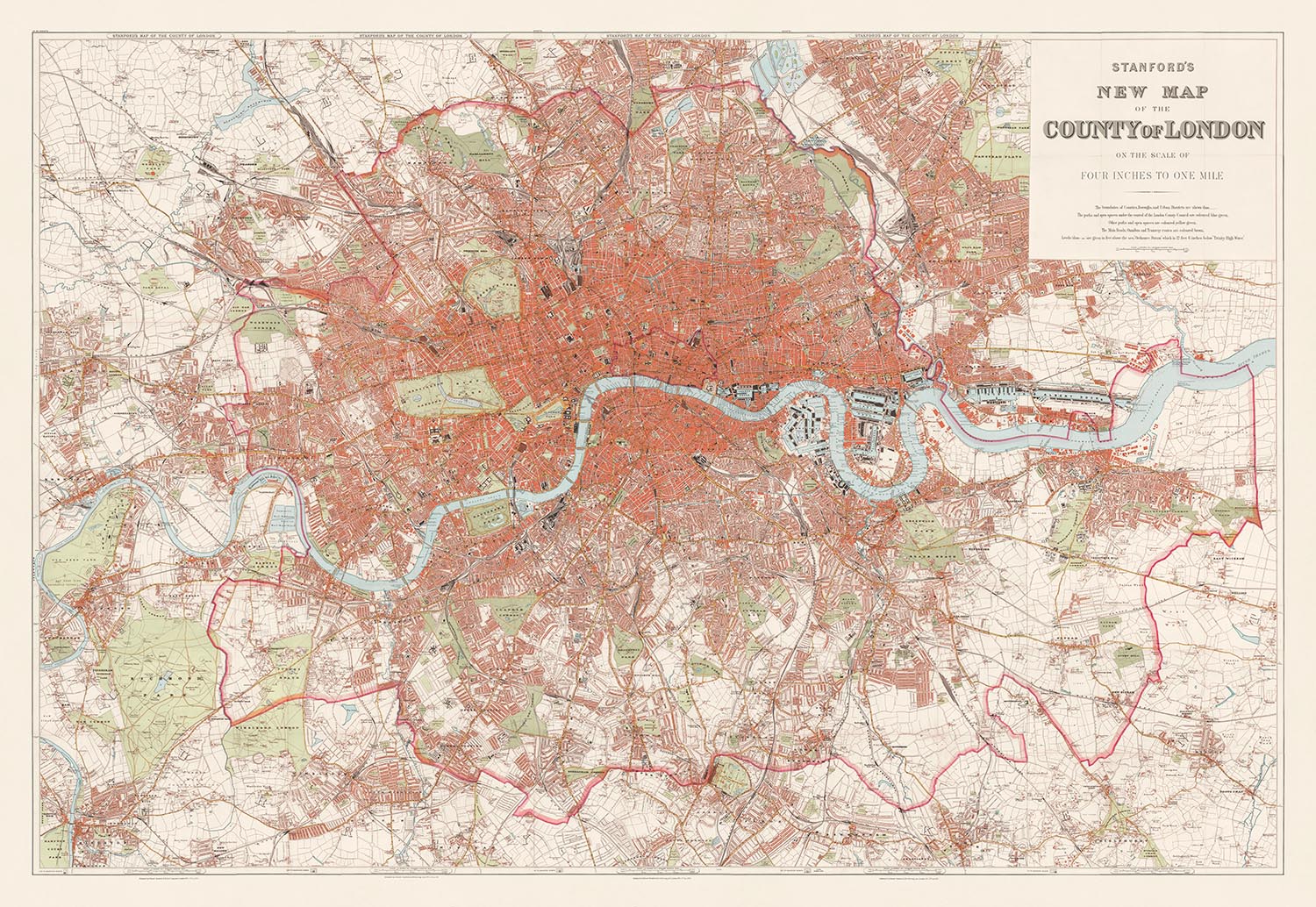 Large Wall Map of London by Stanford, 1905: Red Coloured Victorian Chart