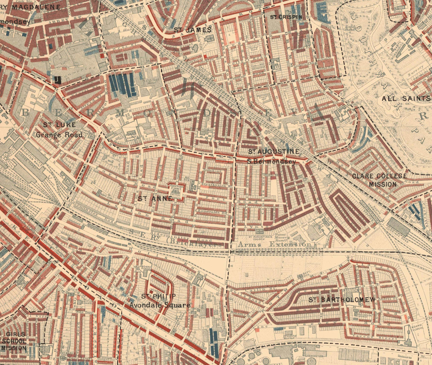 Map of London Poverty 1898-9, Inner Southern, by Charles Booth: Southwark, Waterloo, London Bridge, Camberwell, Peckham, Bermondsey