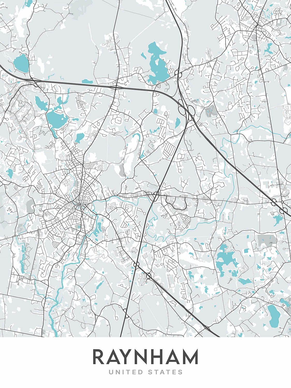 The Raynham map is a modern, detailed street map without labels, focusing on the city of Raynham in Massachusetts. This map is a beautiful and informative piece of art, perfect for any home or office. The map covers a large area, extending approximately 9 miles to the north and south of the city center, and 7.5 miles to the east and west. This ensures that all of the major landmarks and points of interest in Raynham are included.