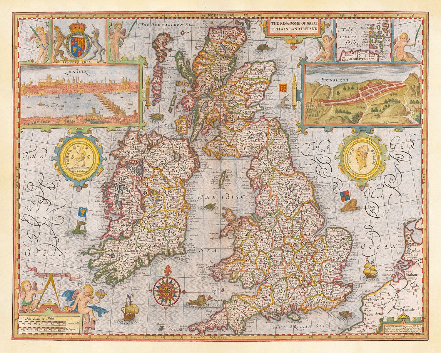 Old Map of British Isles in 1611 by John Speed: UK, England, Scotland, Wales, Ireland