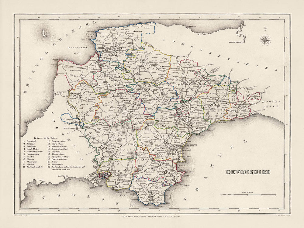 What makes this map truly remarkable is not just the depth and detail with which it depicts Devonshire, but also its historical significance. Dating back to the mid-19th century, this authentic document offers a snapshot of Devon's settlements and geographical landmarks as they existed prior to significant urban expansion and industrial development. In an age before satellite imagery and GPS technology, Lewis's map is an impressive feat of cartography that faithfully captures Devon's intricate geographical details and vast array of settlements.