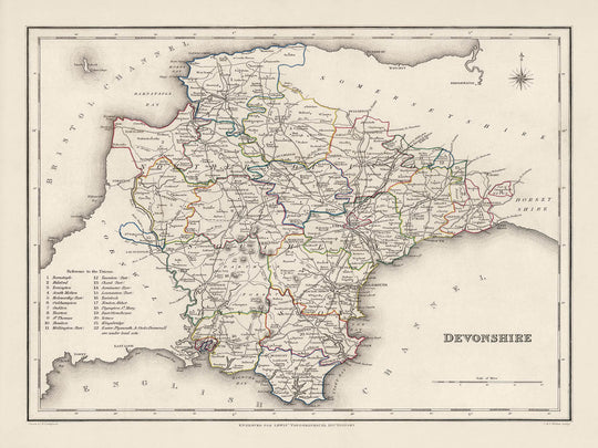 Experience a journey into the past with this exquisite 1844 map of Devonshire by renowned cartographer Samuel Lewis. This stunning relic from the Victorian era is steeped in the rich history of the county, revealing its settlements, geographical features, and historical events. From the bustling cities of Exeter and Plymouth to the picturesque towns along the River Dart, the map paints a vivid picture of Devon's landscape nearly two centuries ago. A treasure for history buffs, cartography enthusiasts, and Devonians alike, it provides a fascinating glimpse into a time when the county's modern cities were either in their infancy or yet to be founded, and some locations might exist under their earlier names.
