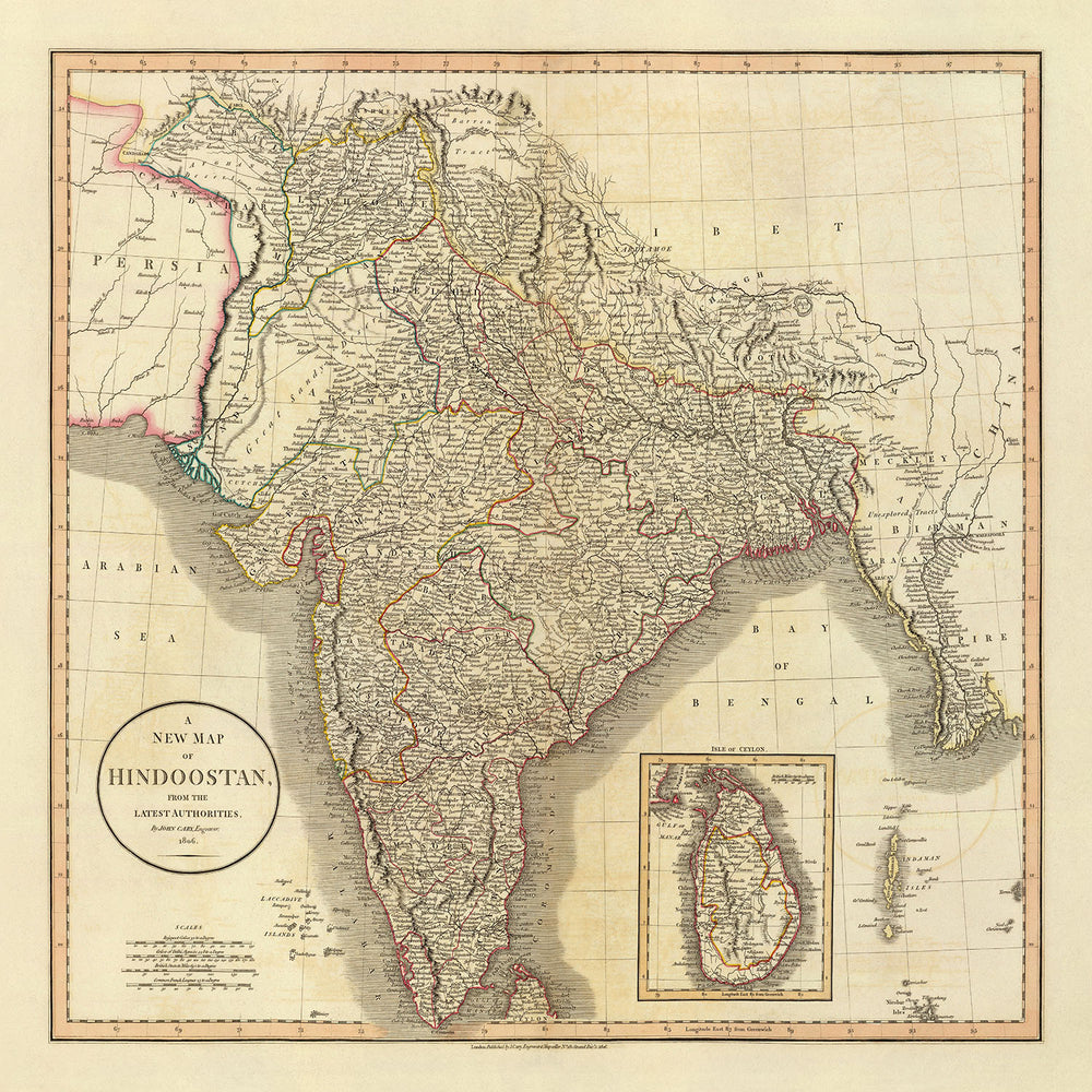 Stepping into the pages of history, the 'Hindoostan & Ceylon' map, published by John Cary in 1806, presents a richly detailed panorama of the Indian subcontinent. The map encapsulates the geographical contours of India, Pakistan, and Bangladesh, with the primary focus being on the country map of India. It is a testament to Cary's commitment to precision and detail, capturing the intricate political and physical landscape of the region. The map also includes the provinces of Kabul and Kandahar in Afghanistan, a noteworthy inclusion that reflects the geopolitical significance of these regions during the time.