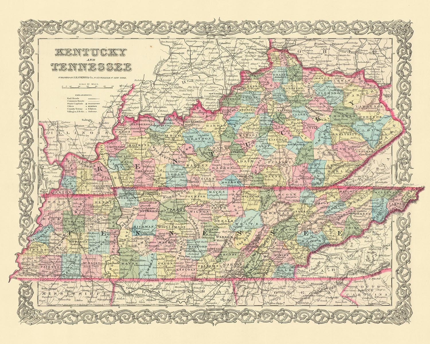 Immerse yourself in the rich tapestry of American history with this exquisite old map of Kentucky and Tennessee, meticulously crafted by the renowned mapmaker, J. H. Colton, in 1855. A testament to Colton's reputation as one of the finest American mapmakers of his era, this map offers a rare glimpse into the early days of the United States, a time when many settlements were yet to be established and the nation was in the throes of defining its identity.