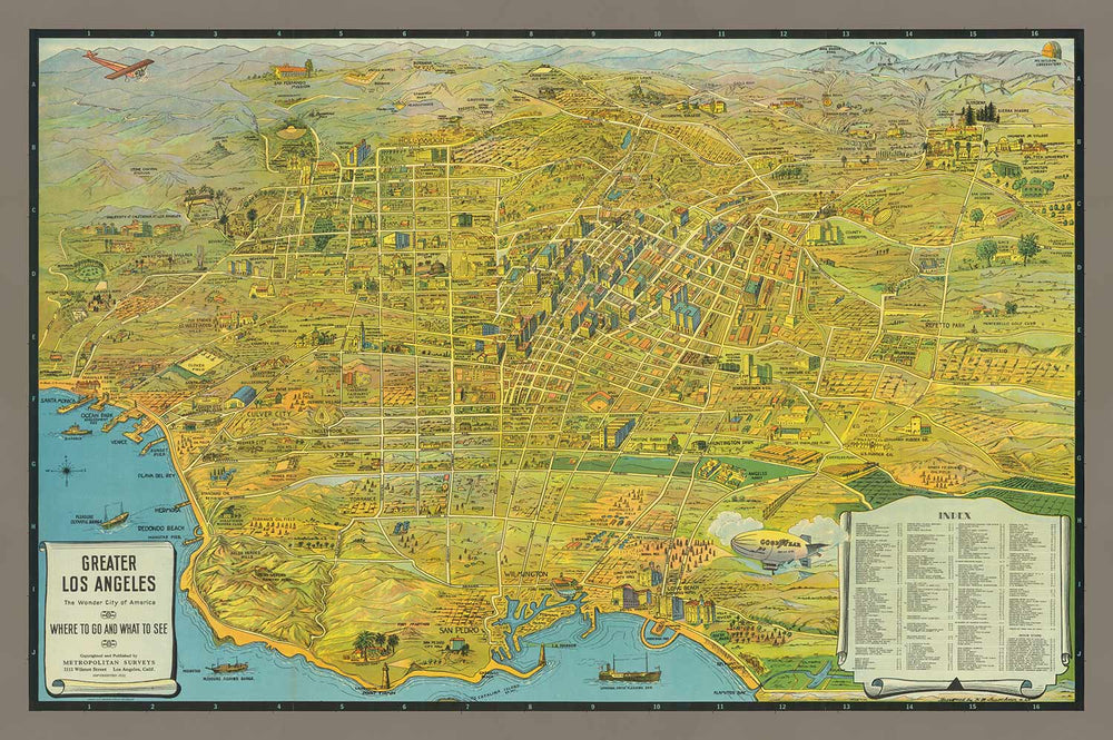 Of course, being a pictorial map, almost all of the notable LA landmarks (or those that existed in the 1930s) can be seen on this map too, such as the Hollywood Bowl, Rose Bowl, Fox Studios, Venice Pier and Santa Monica Pier.
