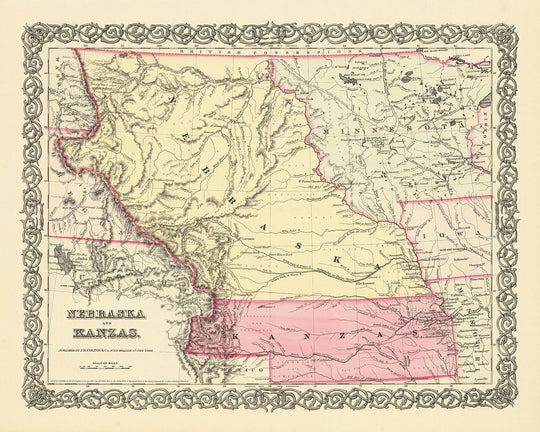 Immerse yourself in the rich tapestry of American history with this exquisitely detailed old map of Nebraska and Kansas from 1856. Crafted by the renowned mapmaker J. H. Colton, widely acclaimed as the finest American mapmaker of his era, this map offers a unique glimpse into the early days of these territories, a time when the United States was still in its formative years. The map showcases the meticulous craftsmanship and attention to detail that are the hallmarks of Colton's work, and it stands as a testament to the indomitable spirit of exploration and discovery that defined this epoch.