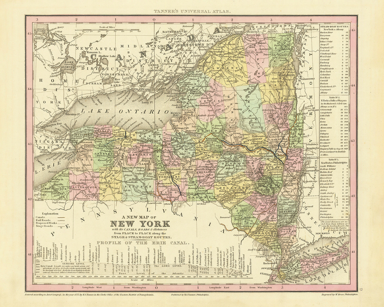 Immerse yourself in the intricate historical charm of this exquisite old map of New York State by renowned cartographer H. S. Tanner, published in 1836. This magnificent piece of cartography boasts an extensive record of the era's burgeoning infrastructural feats – canals, roads, railroads, and distances between pivotal points of interest, a testament to the growth and industrialization that was sweeping the state and indeed the nation at the time.