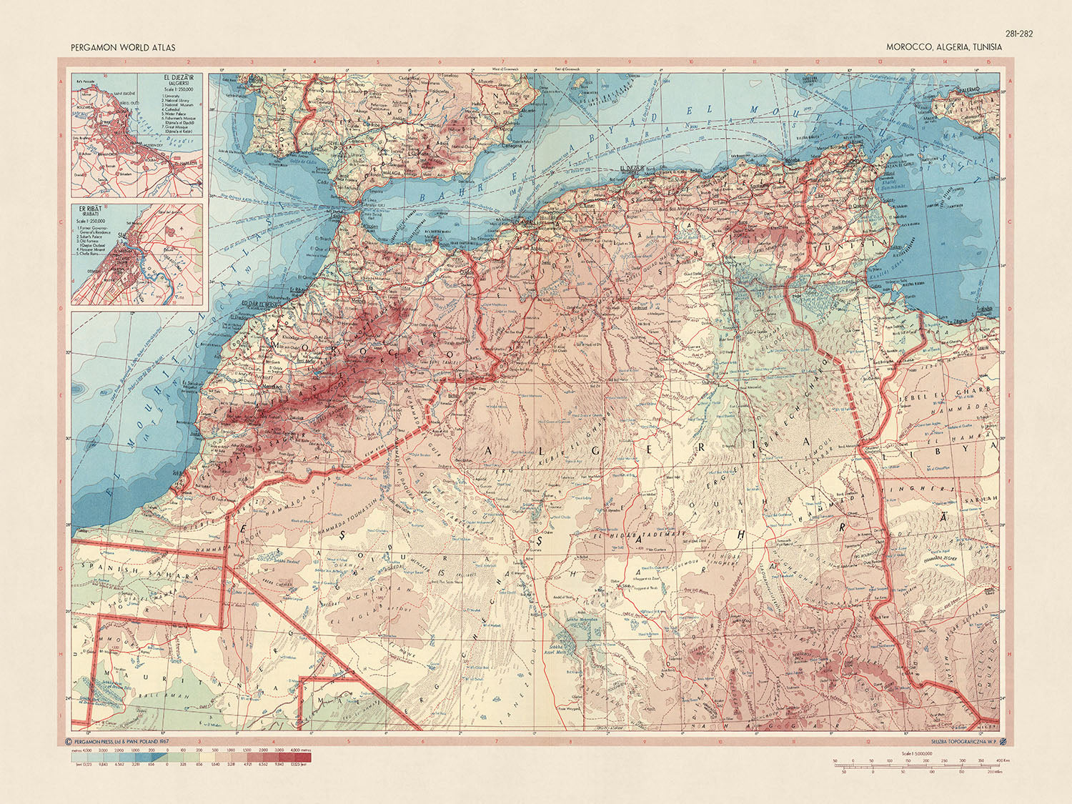 The exquisite map 'Morocco, Algeria, Tunisia', is a magnificent testament to the expertise of the Polish Army Topography Service, renowned for their precision and attention to detail. Published in 1967, this map captures the intricate political and physical landscapes of Northwest Africa with an extraordinary level of detail. Each city, town, and landmark is meticulously represented, demonstrating the mapmaker's commitment to accuracy and depth of understanding. The insets of El Djezair (Algiers) and Er Ribat (Rabat) offer a more focused view of these significant cities, providing an intimate exploration of their unique geographies.
