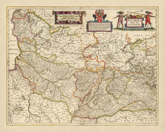 Immerse yourself in the rich history of the Picardy region of France with the 'Picardia vera et inferior' map, crafted by renowned cartographer Nicolaes Visscher II in 1690. This piece, whose title translates to 'True and Lower Picardy', provides a detailed depiction of the different regions and political divisions of the time. Visscher, the grandson of Claes Janszoon Visscher, hailed from a lineage of esteemed mapmakers from the Dutch Golden Age, and his expertise is evident in the intricate details and precise rendering of this map.