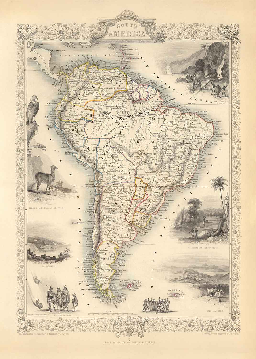 This delightful, Victorian map of South America was originally engraved by John Rapkin and published by J. Tallis & Co in 1851. It is presented here with its original 150-year-old handcolouring and is, without doubt, one of the finest and most detailed historic maps of South America.