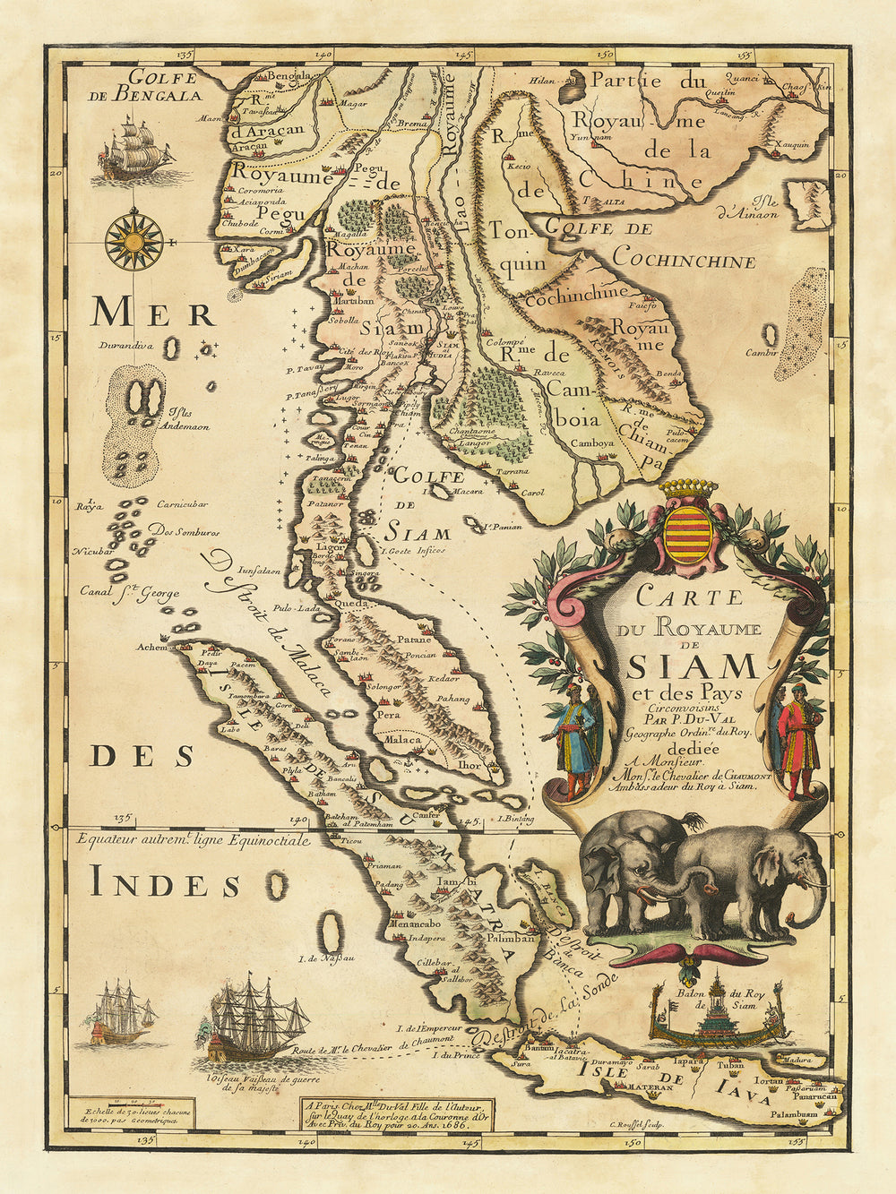 Old Map of Thailand and Indonesia by Pierre Du Val, 1686: Ayutthaya, Bangkok, Java, Sumatra, Malacca