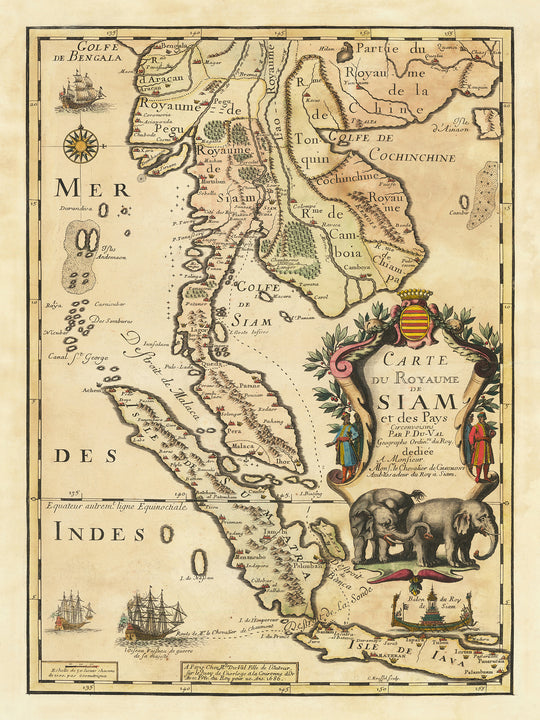 Overall, the old map of the Kingdom of Siam (Thailand) and Indonesia by Pierre Du Val is a fascinating and valuable document that offers a glimpse into the region's rich history. It is a beautiful and informative map that would make an excellent addition to any collection.