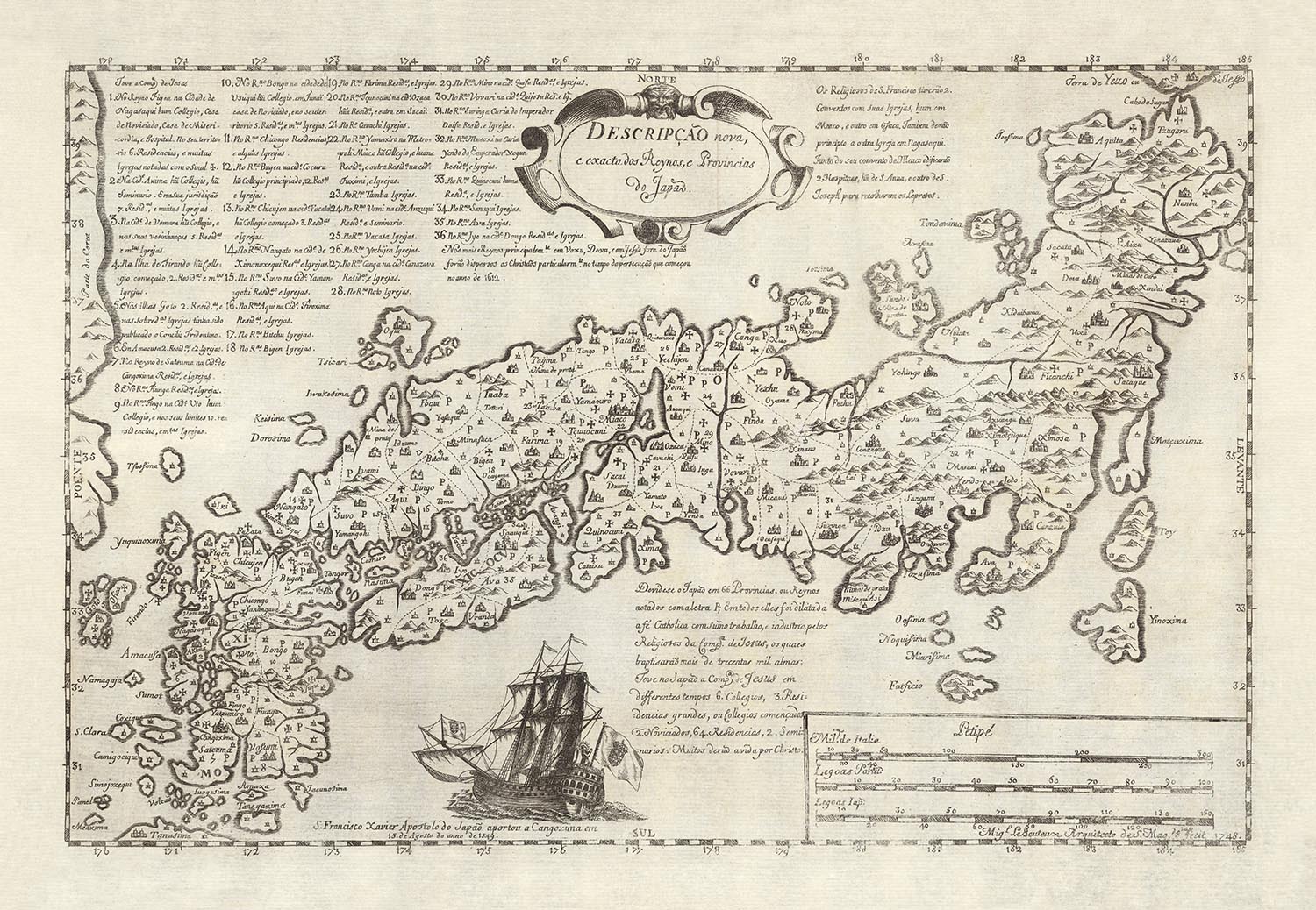 The historical significance of this map is further enhanced by its connection to the Jesuit missions in Japan, particularly through the depiction of the sailing ship at the bottom, symbolizing the arrival of St. Francisco Xavier in Japan in 1549. This element of the map highlights the early interactions between Europe and Japan, spearheaded by figures like Xavier and his companions, who were among the first to introduce Christianity to Japan. The map's origins trace back to the lost manuscript by Moreira, derived from the traditional Japanese "gyoki" style maps, which were known for their unique cartographic conventions dating back to the 9th century. This blend of indigenous and European mapping techniques makes this map a fascinating artifact of cross-cultural exchange.