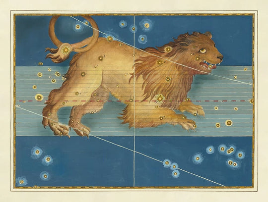 A stunning and exceptionally rare handcoloured celestial chart of the zodiac constellation Leo, The Lion with all of the stars picked out in gold.