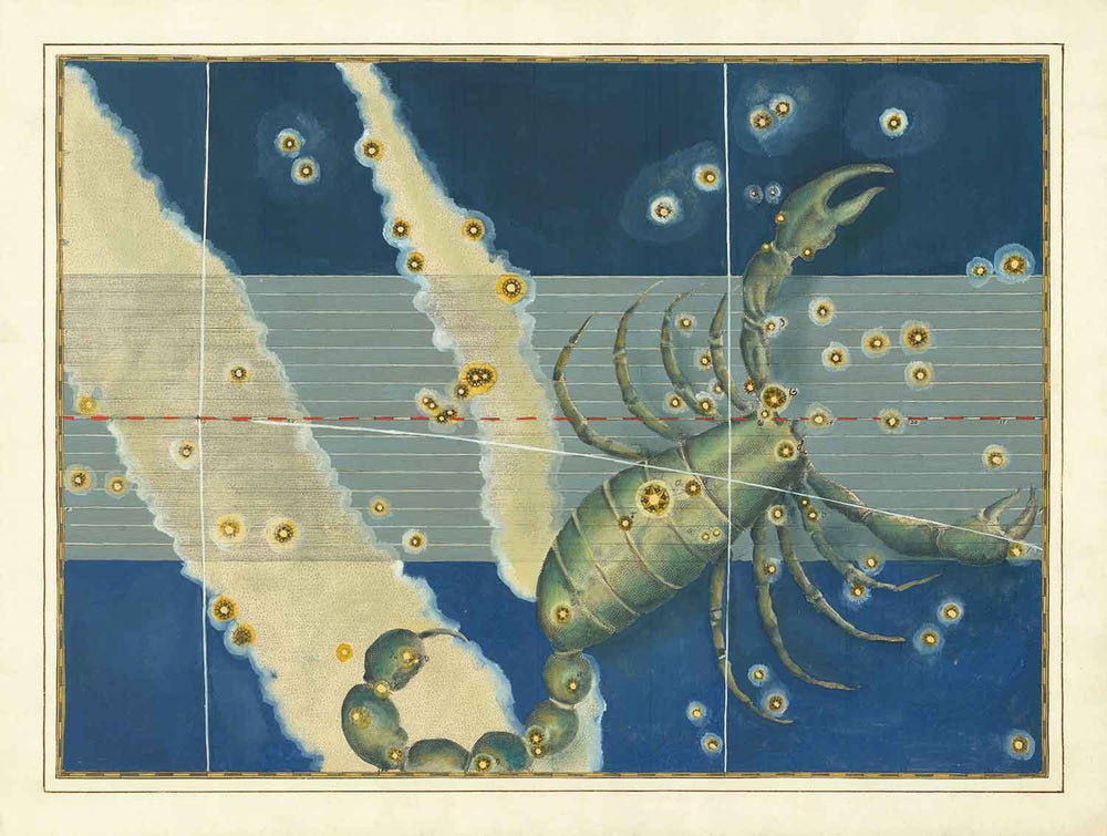 A stunning and exceptionally rare handcoloured celestial chart of the zodiac constellation Scorpio, The Scorpion with all of the stars picked out in gold.