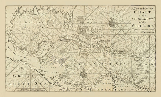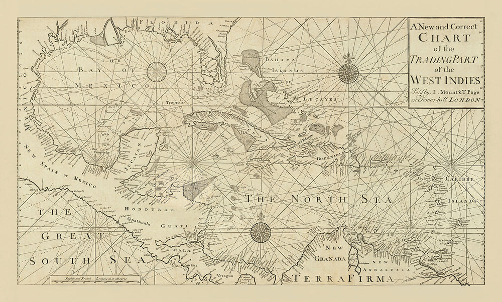 Old West Indies Navigation Chart, 1730 by Page & Mount: Bahamas, Gulf of Mexico, Central America
