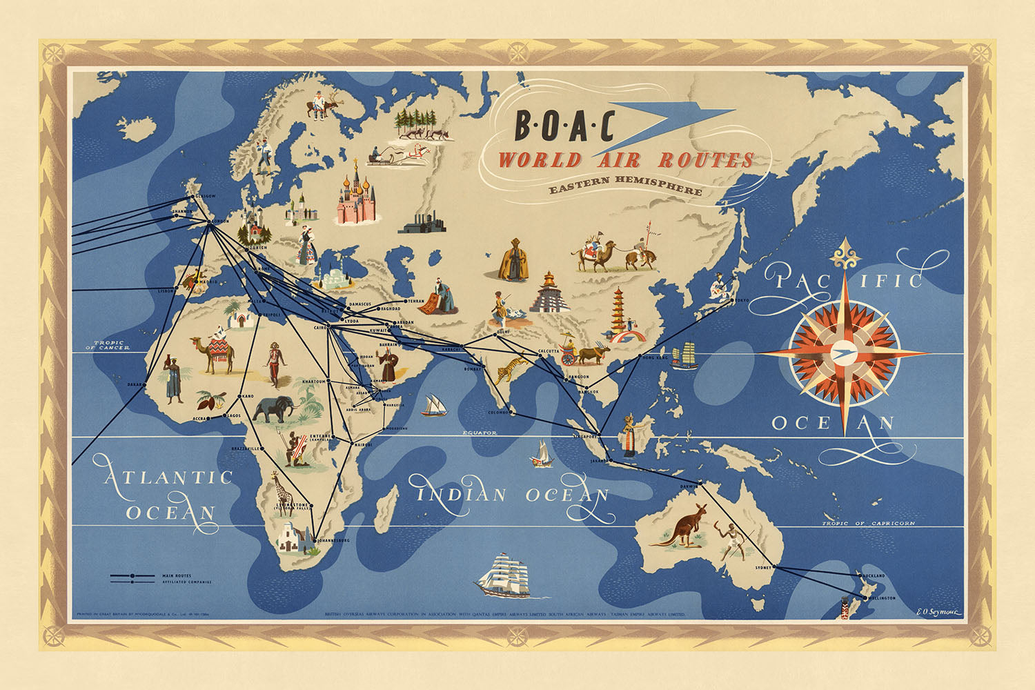 Old Pictorial Map of Eastern Hemisphere Air Routes by BOAC, 1949: Mid-Twentieth Century Aviation