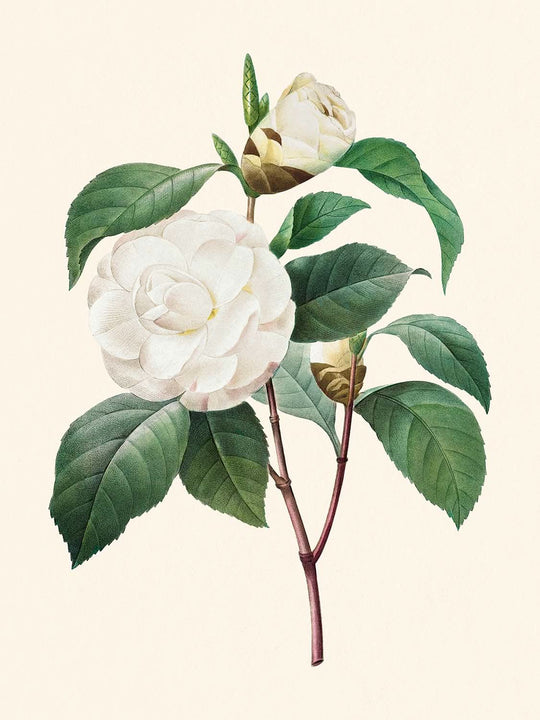 White Camellia, created in 1827 by the renowned botanical illustrator Pierre-Joseph Redouté, stands as a testament to the delicate and intricate beauty captured within Victorian botanical illustrations. Redouté, celebrated for his extraordinary skill and dedication to botanical art, devoted much of his career to painting the exquisite flowers of Château de Malmaison at the behest of Josephine Bonaparte, the wife of General Napoléon. The Belgian-born artist first gained prominence as a painting tutor to Marie Antoinette, which soon led to monumental success and a prolific career, resulting in over 2,100 botanical illustrations of more than 1,800 species.