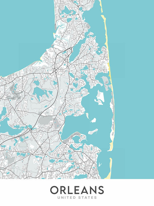 Orleans is a charming town located on the elbow of Cape Cod, Massachusetts. This modern city map, created by The Unique Maps Co. in 2024, focuses on the intricate details of the city's street layout, making it a captivating piece of art for any home or office. The map covers a significant portion of the Cape, extending approximately 9 miles north to south and 11 miles west to east, with the town of Orleans positioned at its heart.