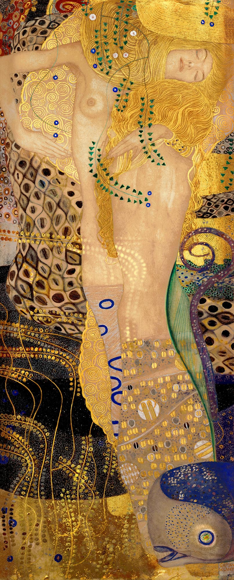 Gustav Klimt's "Girlfriends (Water Serpents I)," originally created in 1904, unfolds a world of mystique and sensual beauty. Klimt, an influential figure in the Vienna Secession movement, is renowned for his ethereal paintings that seamlessly blend reality with the dreamlike. This particular artwork transports us to an enchanting realm where mermaids and serpentine figures drift gracefully through shimmering waters. Merging the elements of nature with the human form, Klimt encapsulates the Symbolist fascination with hybrid beings, mirroring myths such as that of Odysseus and the sirens or tales of neirads and melanistic Ophelia.