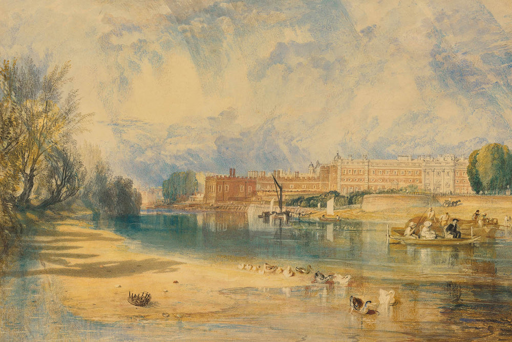The painting "Hampton Court Palace" showcases Turner's incredible knack for detail and movement, highlighting the stately prominence of the palace against a vibrant backdrop of sky and foliage. The interplay of warm yellows and cool blues instills a sense of dynamic contrast and serene beauty, embodying Turner's characteristic style that has captivated art enthusiasts across generations.