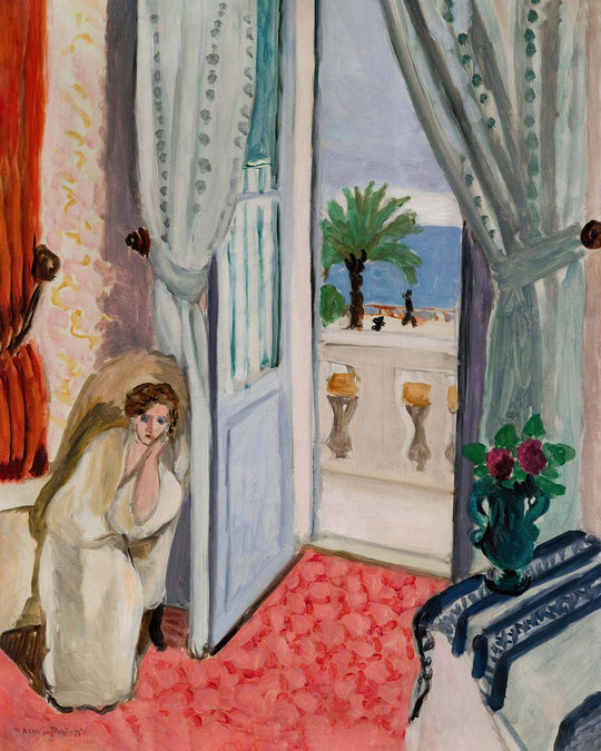 Henri Matisse was a leading figure of modern art, renowned for his use of color and fluid draftsmanship. By 1919, his work had evolved to balance bold colors with compositional tranquility. "Intérieur à Nice," exemplary of this stage in his career, encapsulates these elements with a soothing and elegant palette, featuring dominant reds, cool greens, and hints of blue that create a harmonious balance.