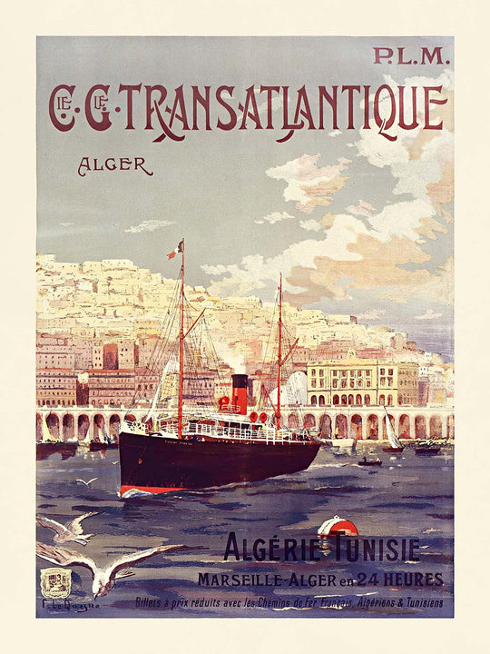 Cie. Gle Transatlantique, Alger by Fernand Le Quesne (1901) is a luminous Belle Époque travel poster inviting the viewer across the Mediterranean to Algiers. Created for the Compagnie Générale Transatlantique in collaboration with the P.L.M. railway, the design celebrates the speed and romance of turn‑of‑the‑century travel. In the image, a black‑hulled liner with a single red funnel glides into a deep blue harbor, gulls skimming the whitecaps in the foreground while Algiers rises behind in sun‑bleached tiers and graceful seaside arcades. The poster’s hand‑lettered notes “Algérie Tunisie” and “Marseille–Alger en 24 Heures” evoke the era’s streamlined connections between France and North Africa.