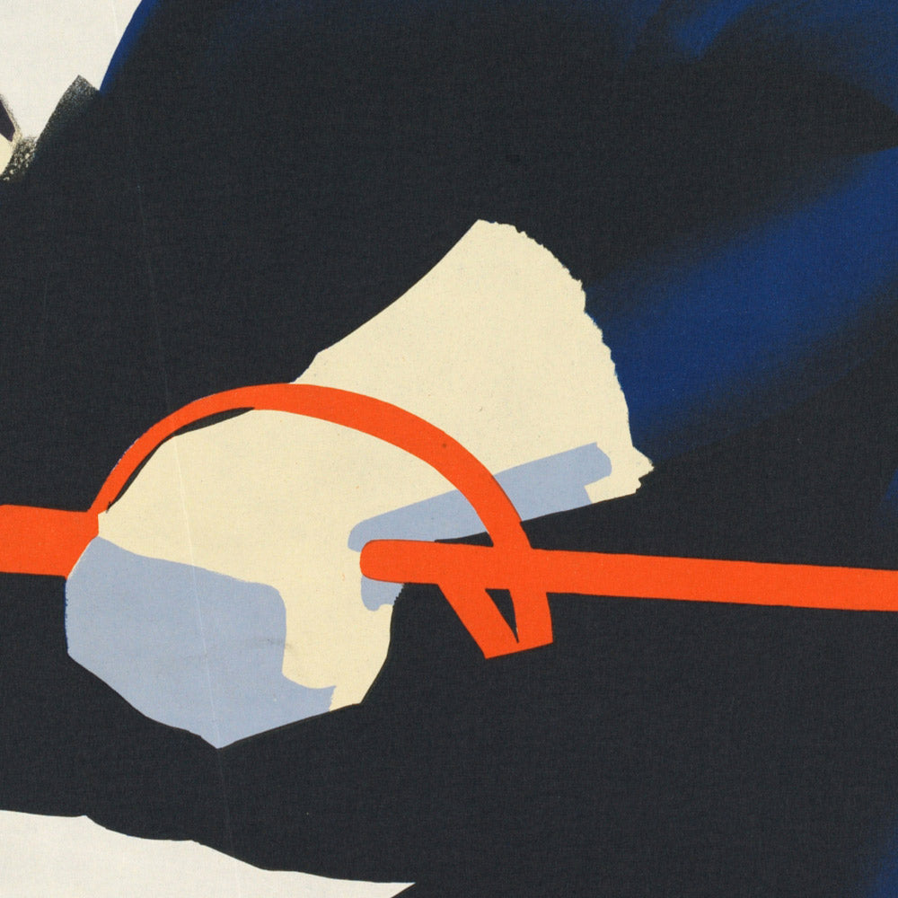 This Austria poster is among his most memorable travel designs. Commissioned for national tourism promotion, it positions winter sport as the country’s calling card, a message that still resonates today for those who’ve skied or dreamed of skiing the Austrian Alps. The diagonal thrust of the figure, the long, clean arc of the ski pole, and the immense white field create a palpable feeling of speed and alpine air.