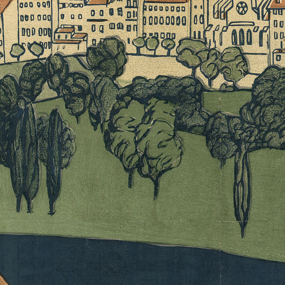 Design-wise, the print balances flat, harmonious color planes with carefully simplified forms. Deep, forest greens frame the scene; the Aare reads as a cool blue ribbon; and the old town glows in soft beiges and creams—an homage to Bern’s sandstone architecture. The restrained Art Nouveau/Jugendstil sensibility, with its confident silhouette and sunlight-washed palette, makes this artwork exceptionally versatile in interiors, from modern minimalism to classic European decor. It is a compelling choice for anyone who loves Swiss design, urban history, or the serenity of riverine landscapes.