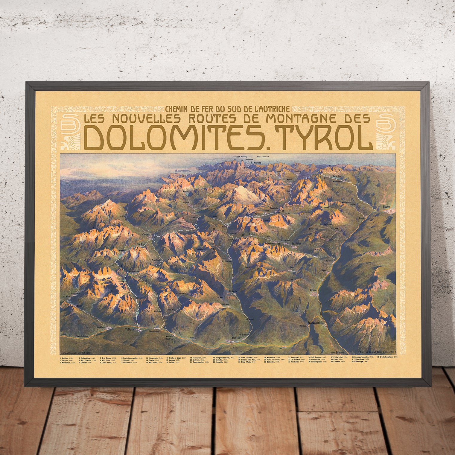 The subject here is the high heart of the Dolomites when the region formed part of historic Tyrol, promoted to travelers via the Southern Railway and its connecting mountain roads. The map‑like panorama teems with destinations that continue to inspire today’s skiers, hikers and cyclists: Cortina d’Ampezzo and its Cinque Torri, the Sella massif, Val Gardena and the Seiser Alpe. At the foot of the image, a legend enumerates the great peaks—labels you can read clearly include Antelao, 3264; Sorapis, 3206; Civetta, 3220; Drei Zinnen, 3003; Marmolata, 3344; Langkofel, 3178; Plattkofel, 2970; Puezspitzen, 2915; Geislerspitzen, 3027; Latemar, 2864; and 43 Grasleitenspitzen, 2705—turning the poster into a catalog of Alpine icons.