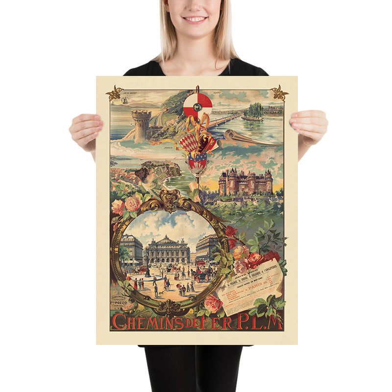 France Travel Poster: Chemins de Fer P.L.M. Lac du Bourget, Genève, Monaco, Château de Pierrefonds by Carlo Cussetti, 1890