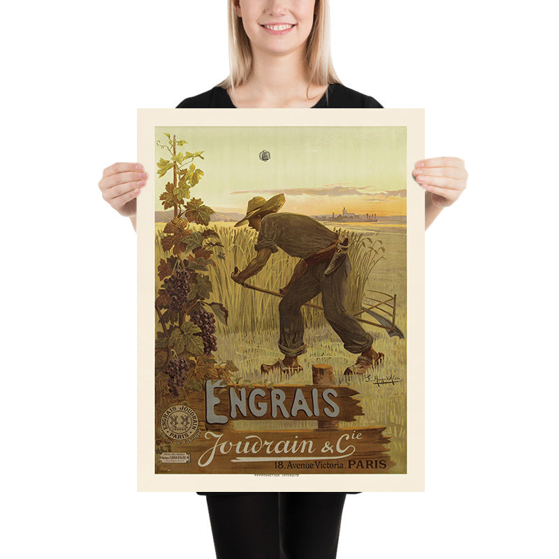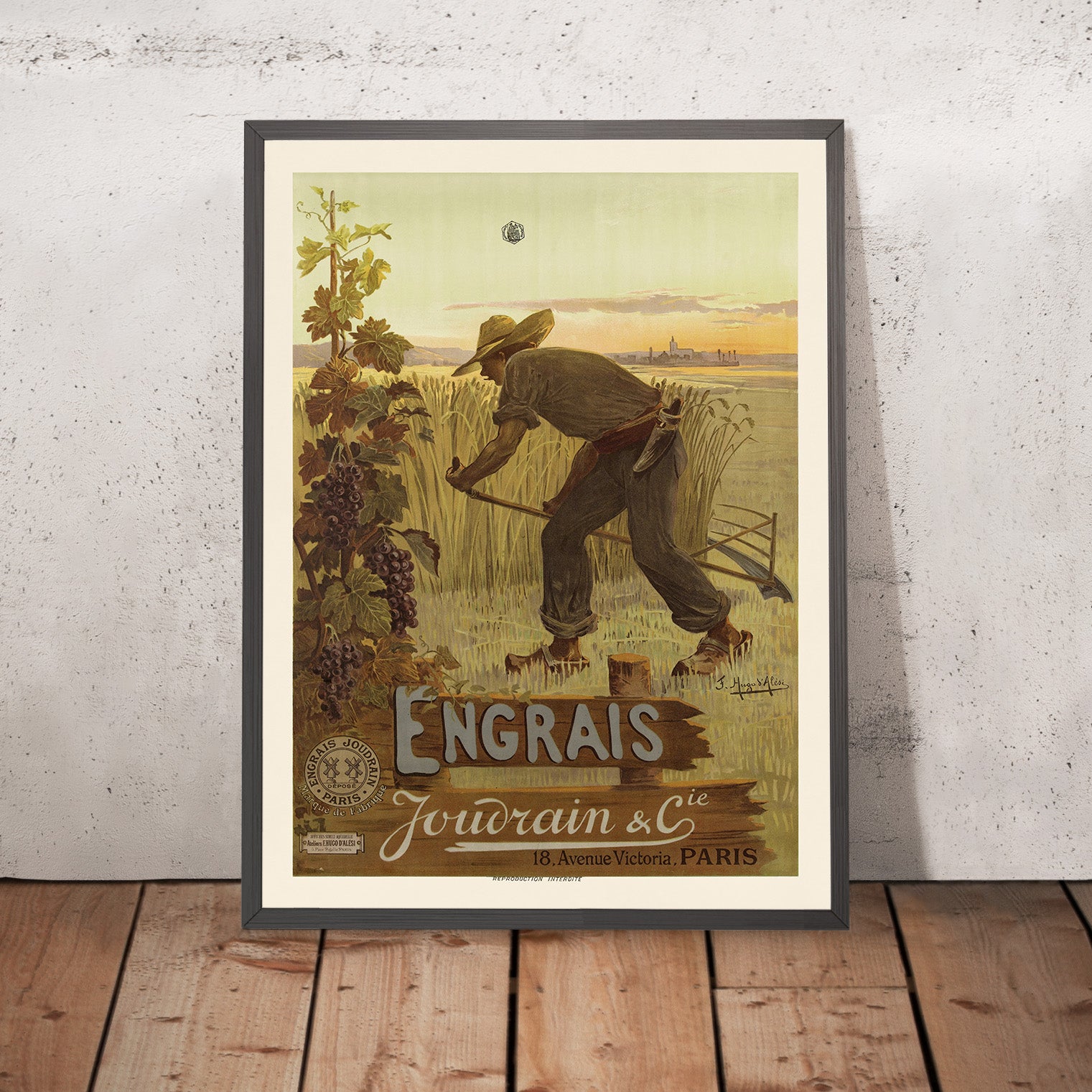 Engrais Joudrain & Cie by Frédéric Hugo d’Alési (1900) captures the Belle Époque romance of rural France through the lens of early industrial advertising. Created by one of the era’s most admired poster artists, this composition promotes a French fertilizer house while evoking the abundance and optimism of turn‑of‑the‑century agriculture. In the original lithograph, a pale, cream-toned header gives way to deeper, earthy tones below, and the company name stands out boldly—an elegant, eye‑catching balance of typographic swagger and pastoral imagery that speaks to both design lovers and Francophiles.