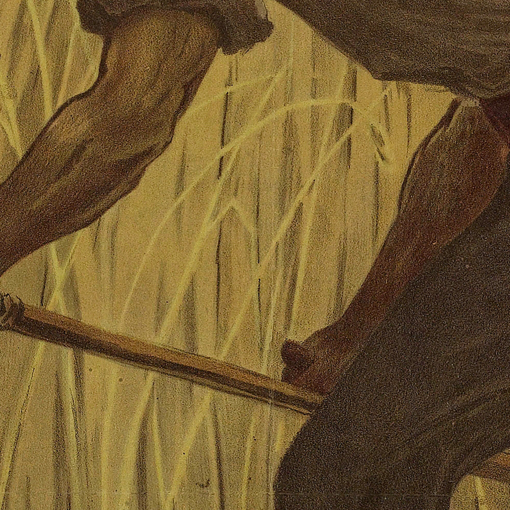 The palette is part of the poster’s enduring charm. Cream and straw-yellow highlights play against ochres, siennas, and rich umbers, creating a warm, rustic atmosphere that feels at home in kitchens, dining rooms, and living spaces. The lithographic textures—softly graduated skies above denser, earthier forms below—add depth and tactility, while the headline typography provides a crisp, graphic counterpoint. It’s a versatile statement piece: both a conversation starter and a soothing, nostalgic presence on the wall.