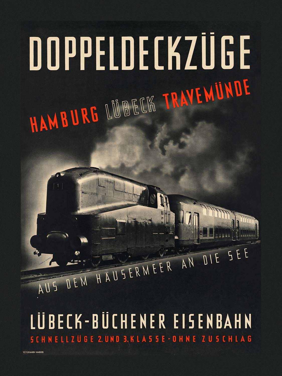 Design and color: the composition is a masterclass in mood and momentum. Black dominates, softened by smoky greys that model the steel skin of the train; cream lettering anchors the layout; and a flash of red brings urgency to the destination list. The low, three‑quarter viewpoint and the slanted subtitle give a cinematic push forward, making this an eye‑catching statement piece for modern, monochrome, or industrial interiors. At the lower left, the discreet “Petermann Hamburg” imprint underscores the poster’s period production values.