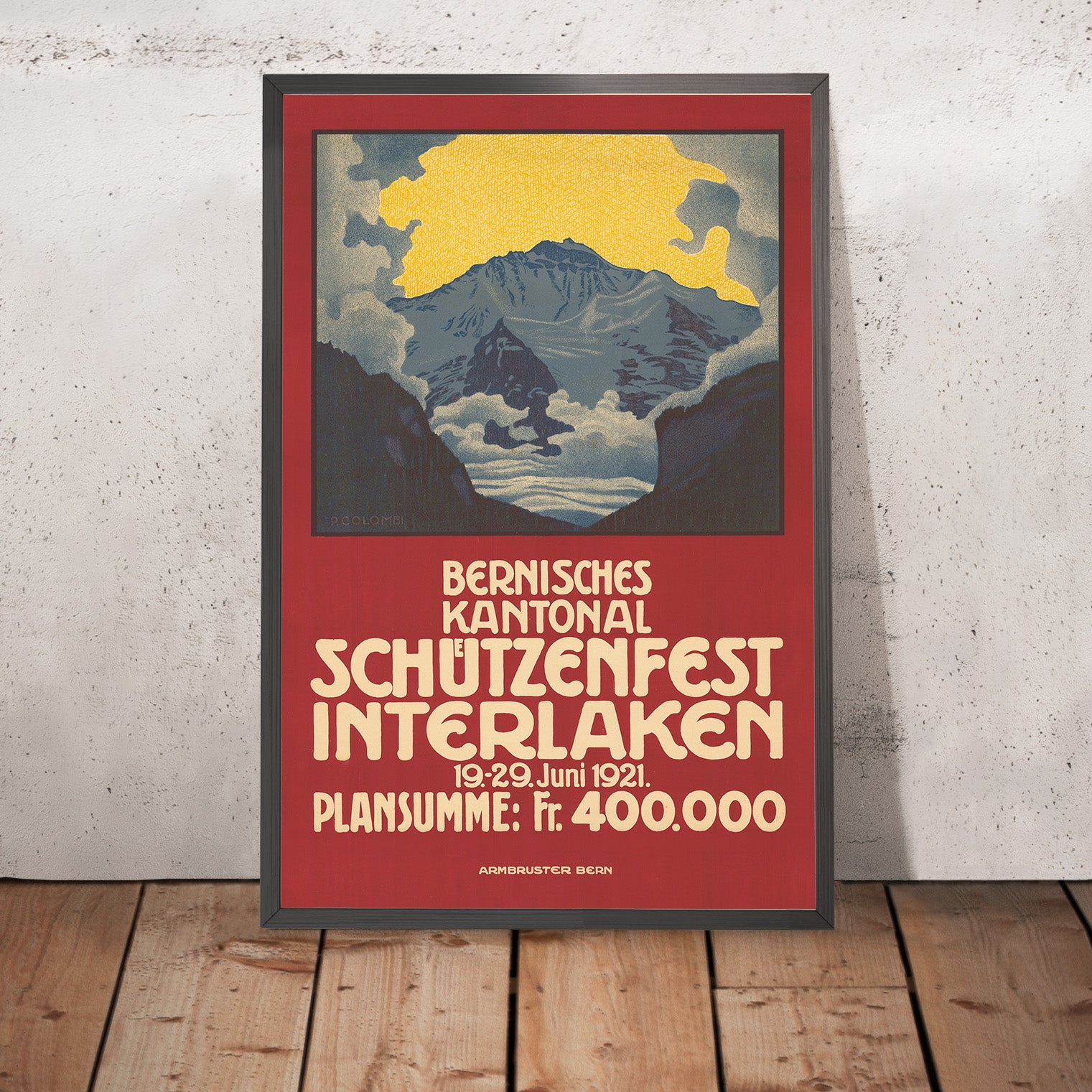 This 1921 poster is notable for its cultural and geographic resonance. Interlaken—nestled between Lake Thun and Lake Brienz—serves as the storied gateway to the Jungfrau region, drawing travelers with its lakeside promenades and alpine excursions. The Bernese cantonal shooting festivals are community celebrations of sport, camaraderie, and regional identity; by advertising such an event, Colombi’s design doubles as a travel invitation, tying festival pride to the promise of alpine adventure. For anyone who has strolled Höheweg, admired the Jungfrau, or sailed the twin lakes, the image channels a memorable sense of place.