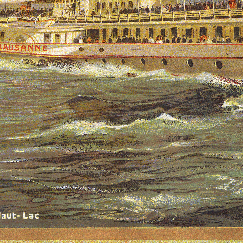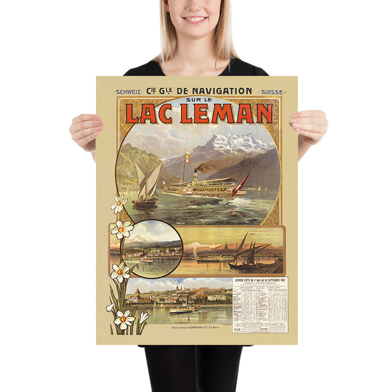Cie. Gle. de Navigation sur le Lac Léman (1909) by Anton Reckziegel is a quintessential Belle Époque travel poster celebrating the Compagnie Générale de Navigation and the timeless allure of Lake Geneva. Designed at a moment when elegant steamers stitched together the lake’s shoreline towns, this French-language poster evokes the romance of journeys between Geneva, Lausanne, Vevey, and Montreux amid crisp mountain air and glittering water. In the composition, a broad band of lake blue anchors the lower half while a sunlit, yellow-tinged sky opens above—an eye-catching contrast that instantly summons memories of Léman’s luminous horizons.