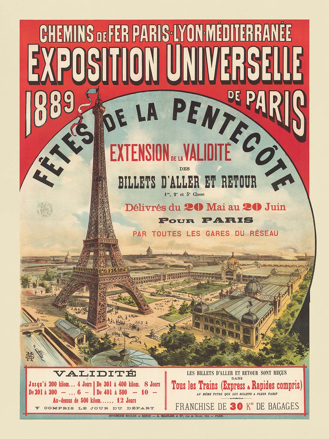 Chemins de Fer Paris, Lyon, Méditerranée. Exposition universelle de Paris, 1889 by M. Stéphane bursts with the excitement of World’s Fair–era Paris. Issued for the 1889 Exposition Universelle—the year the Eiffel Tower opened—the poster invites holidaymakers to the capital on the great PLM rail network. A sweeping red arch announces “Exposition Universelle de Paris 1889,” while a powder‑blue circular sky frames the newly built Tour Eiffel rising above the exhibition grounds. Look closely and you’ll spot elegant halls lining the Champ de Mars, a diagonal railway cutting in at lower left, and period typography that proclaims “Fêtes de la Pentecôte,” “Extension de la validité des billets d’aller et retour,” and travel dates “du 20 Mai au 20 Juin,” even promising a “Franchise de 30 K de bagages.”