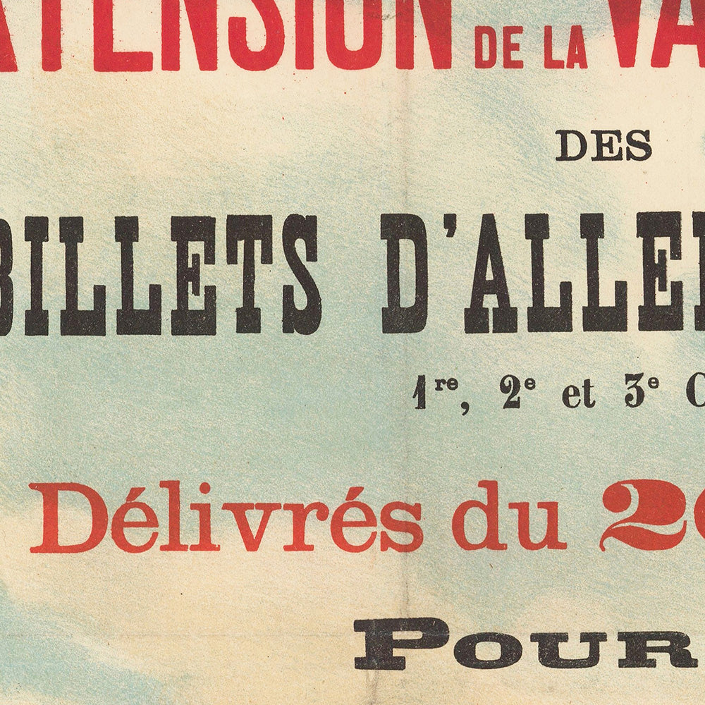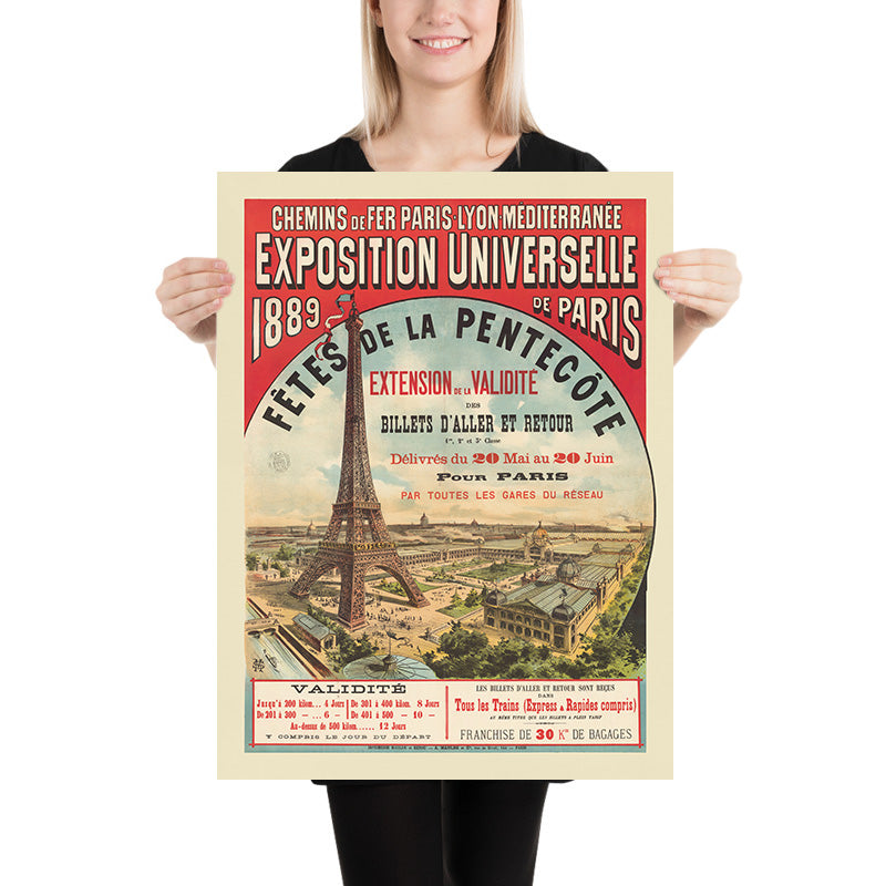 About the style: Rendered as a color lithograph, the composition balances spectacle and clarity. The beige ground and soft blue gradient give air and light to the scene, while the emphatic red header and black letterforms relay information with theatrical impact. The circular “window” of sky focuses the eye on the Eiffel Tower’s filigree ironwork, and the diagonal rail line animates the foreground—details that make this print both a historic document and a striking design object for contemporary interiors.