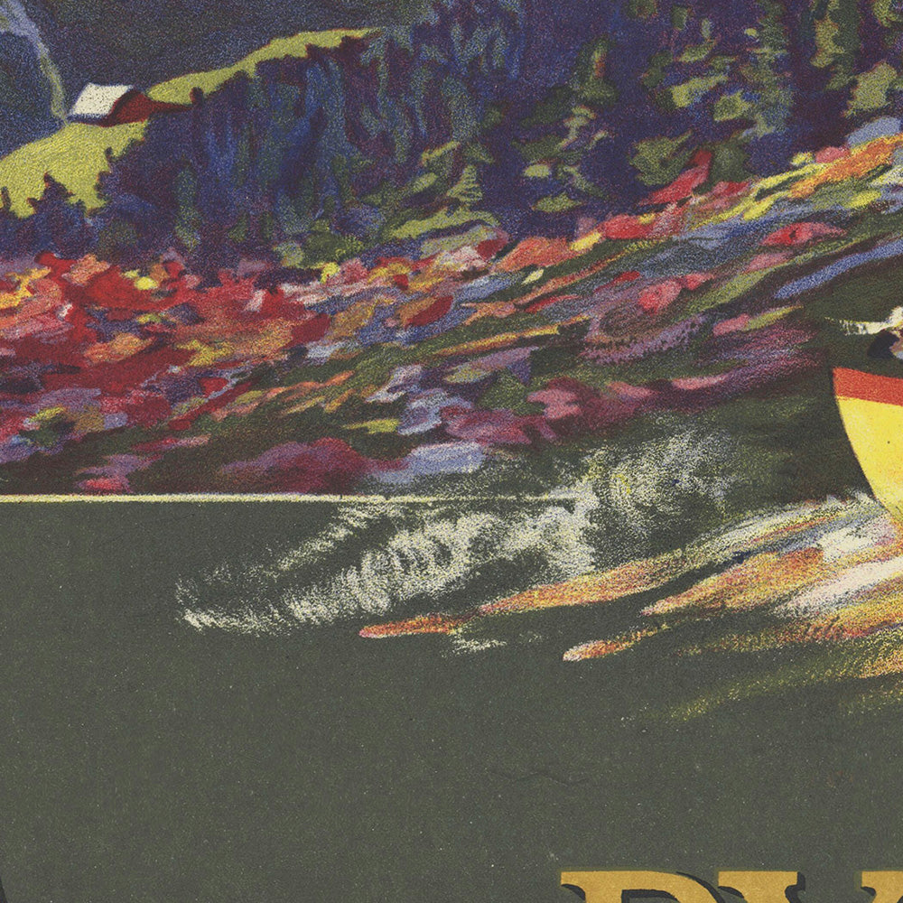 Chemins de fer du Midi. Route des Pyrénées – excursions par Auto-cars by Henri Polart (1913) is a luminous Belle Époque travel poster inviting visitors into the high country of southwestern France. Commissioned by the Midi Railway to promote its scenic “Route des Pyrénées,” it captures the pre–First World War boom in organised motor-coach touring that linked railheads to mountain resorts. At the top, a canary‑yellow open coach sweeps around a sunlit bend above a deep green valley, with violet‑blue ridgelines fading into a peach sky and pink alpine flowers flaring along the verge—an irresistible promise of fresh air and grand horizons.