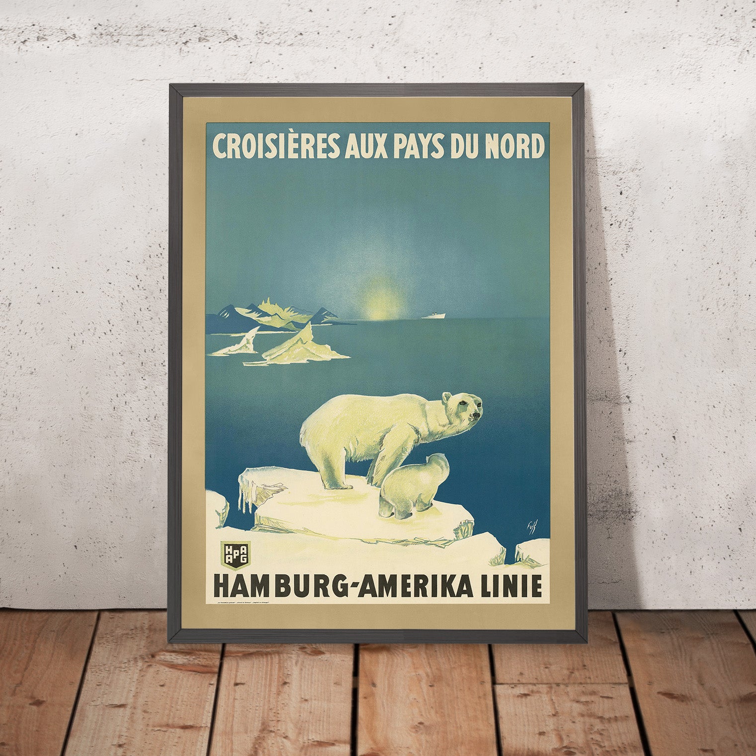 Croisières aux Pays du Nord; Hamburg-Amerika Linie by Albert Fuss (1930) is a quintessential Art Deco travel poster from the golden age of ocean voyages. Created to promote Hamburg-Amerika Linie’s “Northern Countries” cruises, its French headline signals a campaign aimed at Francophone travelers bound for Scandinavia and the North Atlantic. The composition balances crisp geometry and maritime romance: the title CROISIERES AUX PAYS DU NORD is set in bold caps across the top, while HAMBURG-AMERIKA LINIE anchors the lower portion—a clear visual hierarchy that directs the eye through bands of cool blue, clean white, and sun-washed yellow evocative of northern light and sea air.