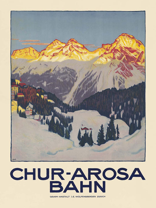 The subject itself is a classic of Swiss tourism: the Chur–Arosa railway climbs sharply through the Schanfigg valley to reach Arosa, a beloved base for winter sports and summer hiking. In 1915, this line embodied engineering ambition and the promise of effortless access to high mountain scenery. Barth’s poster distills that promise—Chur’s cultural charm below, Arosa’s bright lakes and peaks above—into a single, persuasive image that has appealed to generations of skiers, hikers, and railway enthusiasts.