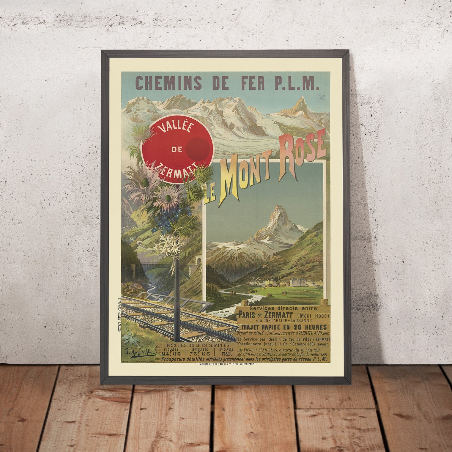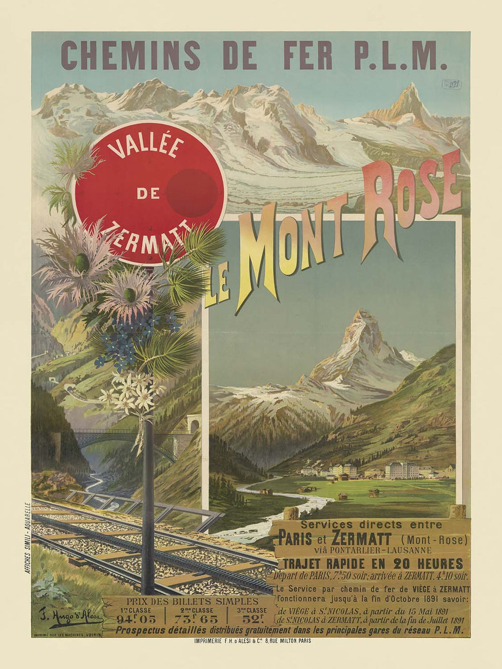 Chemins de fer P.L.M. — Le Mont Rose. Vallée de Zermatt by Frédéric Hugo d’Alesi (1891) captures the glamour of Belle Époque rail travel to Switzerland’s high Alps. Created for the Paris–Lyon–Méditerranée railway, the poster invites travelers to Zermatt and the Monte Rosa massif with a dramatic alpine vista: the crisp, triangular silhouette of the Matterhorn rises over a green valley, while bold yellow‑to‑rose letterforms spelling “Le Mont Rose” sweep across a blue sky. A red enamel‑style roundel reading “Vallée de Zermatt” punctuates the upper left, and a stone viaduct, rushing river, and glinting tracks carry the eye toward the mountains.