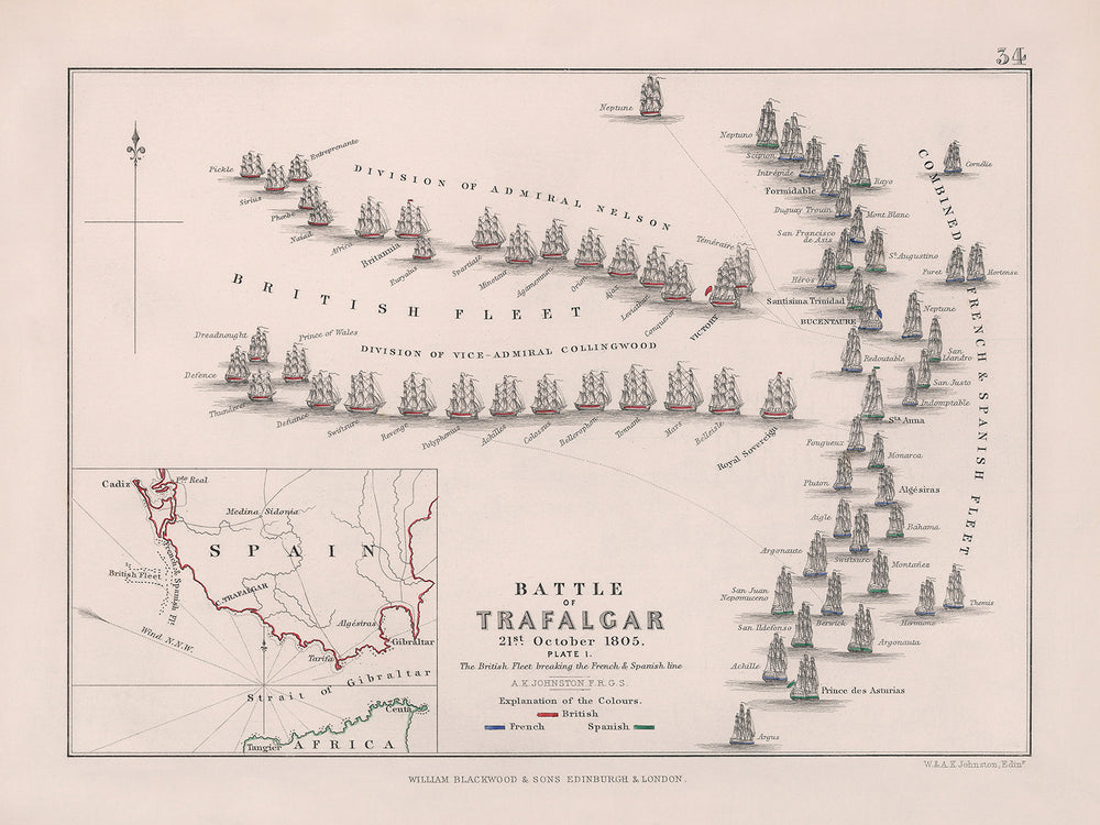The "Battle of Trafalgar: The British Fleet breaking the French and Spanish line" is particularly noteworthy for its vivid depiction of the historic sea battle between Admiral Nelson and Napoleon Bonaparte's fleets. Johnston’s use of colour breathes life into the scene, with British troops marked in red, French in blue, and Spanish in green. The carefully engraved inset map of part of Spain and the Strait of Gibraltar enhances the geographical context of the battle, making it an intriguing visual and educational piece.
