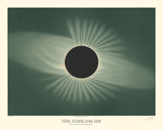 Introducing "The Total Eclipse of the Sun," a magnificent depiction by Etienne Leopold Trouvelot, renowned as the "Audubon of the Sky." Originally published in 1882, this stunning antique colour lithograph captures a total solar eclipse as observed by Trouvelot in the Wyoming Territory during the summer of 1878. This work forms part of Trouvelot's esteemed "Astronomical Drawings" set, published by Charles Scribner's Sons.